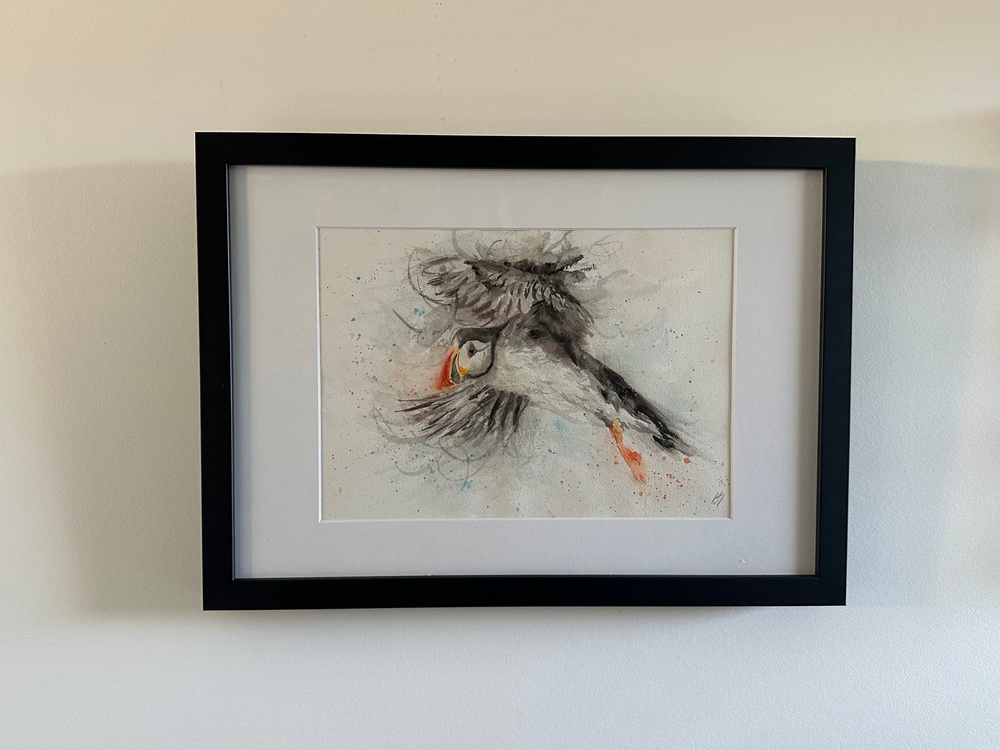 An A4 original watercolour painting, professionally framed in a black A3 frame with a cream mat border and ready to hang.